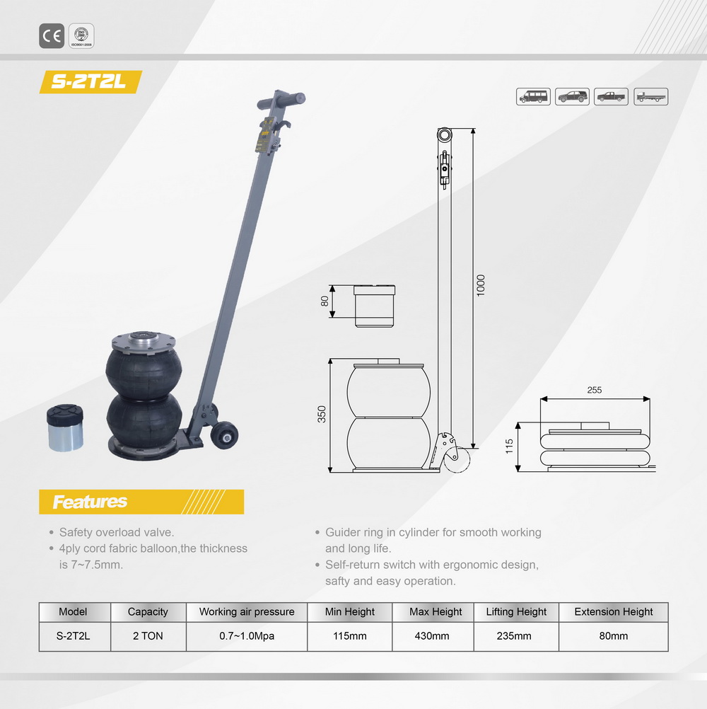 Home / Shop / Jacks / Car / Van / 4x4 Jacks / S-2T2l Two Bag Air Jack with Handle S-2T2l Two Bag Air Jack with Handle€340.00 S-2T2l Two Bag Air Jack with Handle quantity Add to cart Categories: Car / Van / 4x4 Jacks, Jacks Reviews (0) Reviews There are no reviews yet. Only logged in customers who have purchased this product may leave a review. Related products 50 Tonne Two Stage Air Jack €1,300.00 Add to cart AXLE STAND 8 TON PA16 (Each) €150.00 Add to cart Y432021 20-Tonne, Short Air Bottle Jack €350.00 Add to cart 2T-C Compac 2 Tonne Trolley Jack €550.00 Add to cart